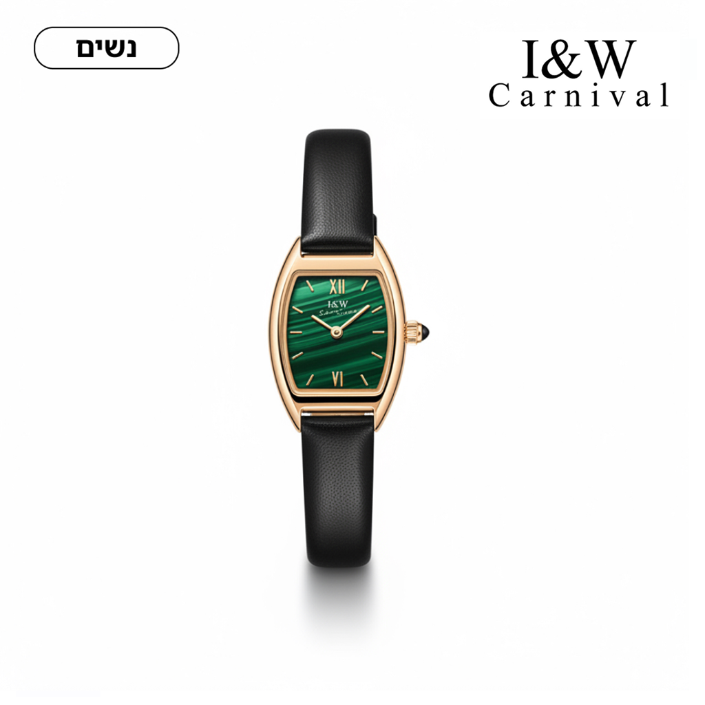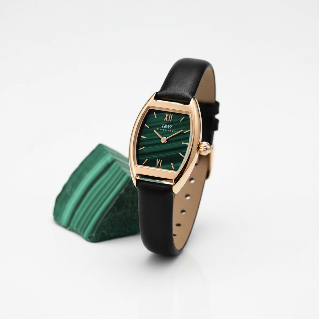 שעון יד יוקרתי בעיצוב קלאסי עם נגיעה מודרנית. מארז בצורת Tonneau מעניק מראה אלגנטי וייחודי, בשילוב חוגה ירוקה עמוקה עם ספרות רומיות – לסטייל מוקפד ומלא נוכחות.